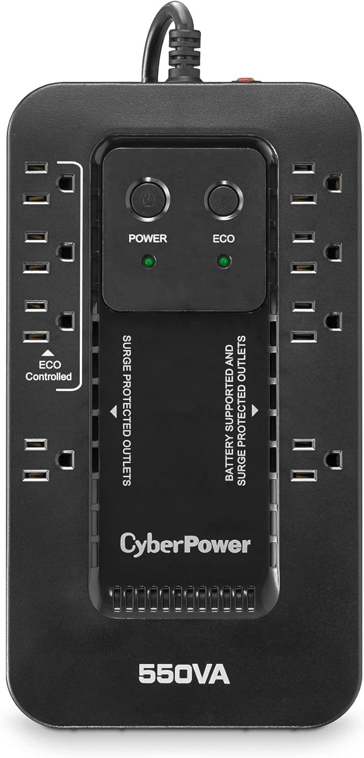 850VA/500W UPS provides battery backup and surge protection for electronics.